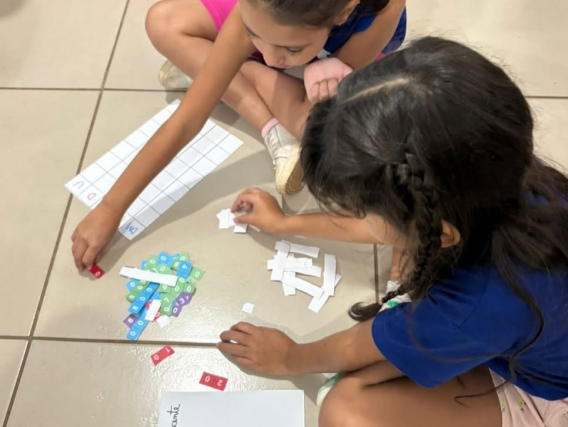Durante o jogo, os estudantes manipularam as fichas para formar números e realizar diferentes decomposições, percebendo como cada ordem contribui para a composição do número total.