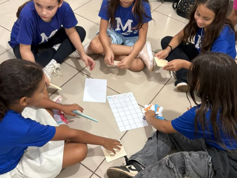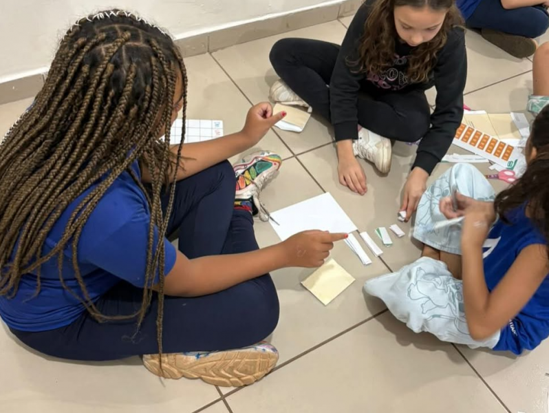 Os alunos do 4º ano A participaram de um jogo de decomposição utilizando fichas sobrepostas, mediado pela professora Ana Luísa.