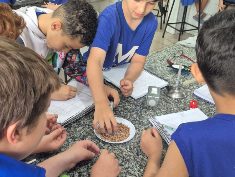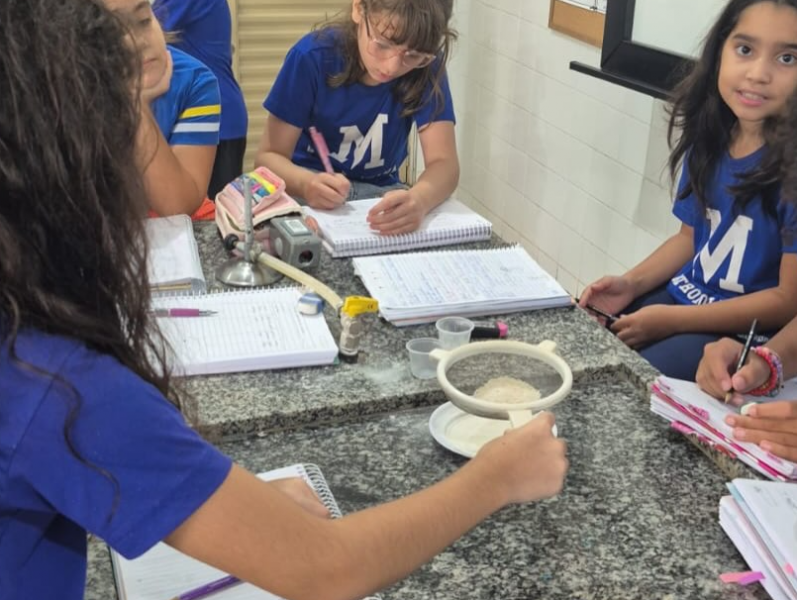 Conduzidos pela professora Carina, os estudantes identificaram e experimentaram diferentes técnicas, como separação magnética, filtração, peneiração e catação, observando como é possível separar os componentes de diversas misturas do cotidiano.