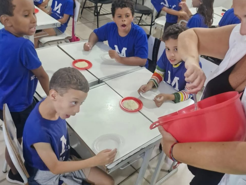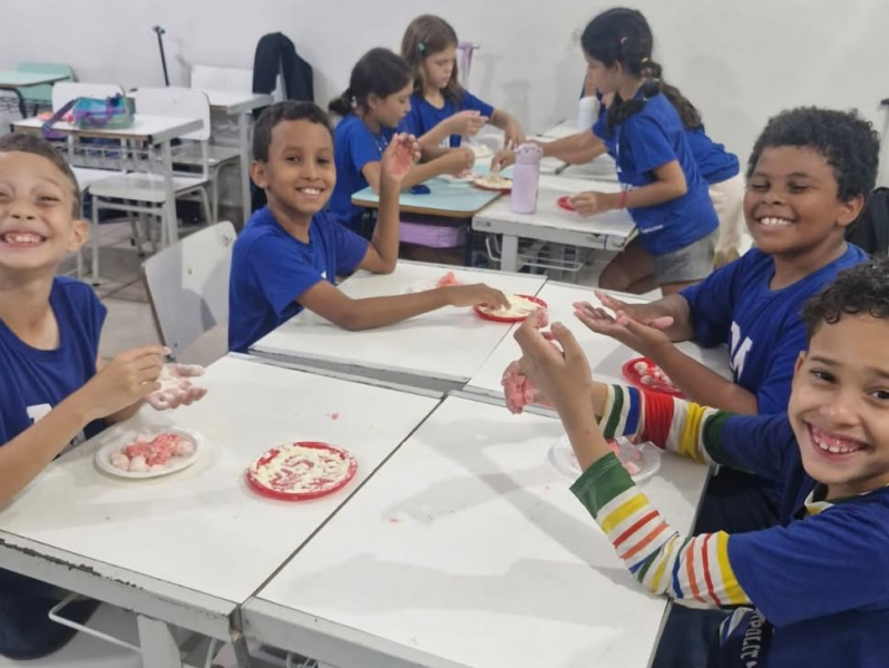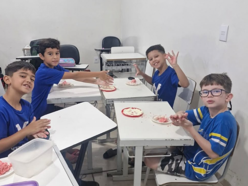 Durante a atividade, os alunos conheceram a estrutura desse tipo de texto, explorando elementos como ingredientes, modo de preparo e a importância de seguir instruções passo a passo.