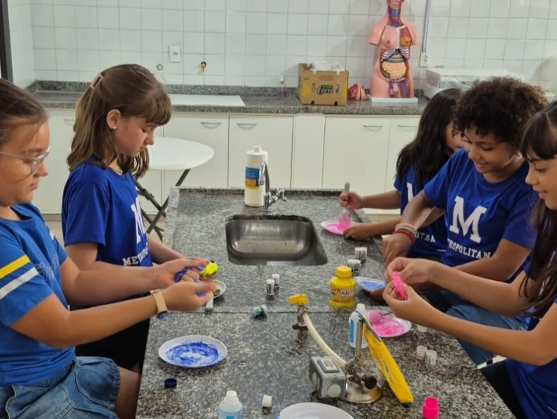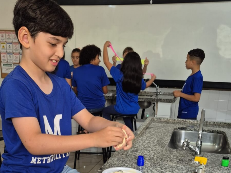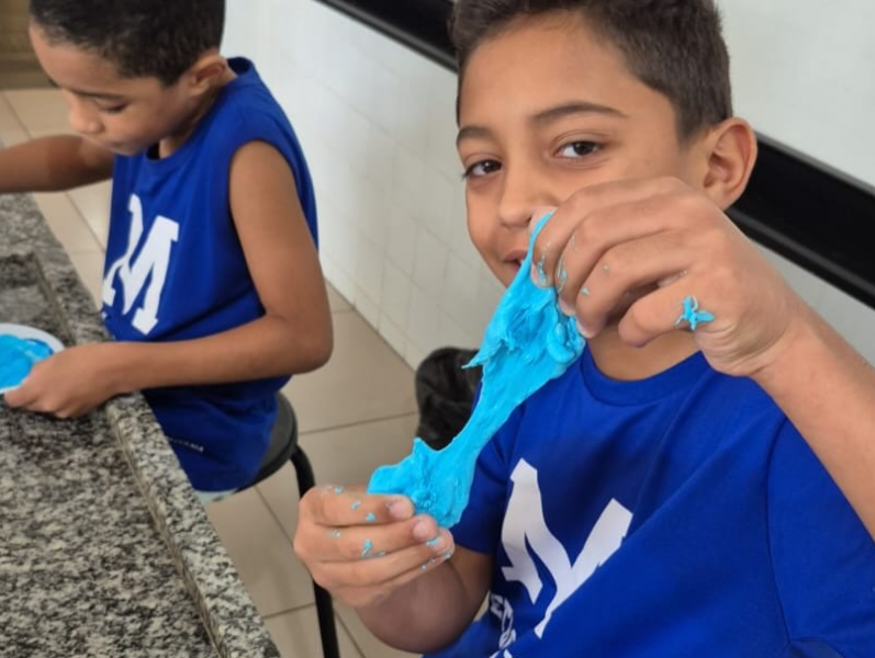 Após estudarem os conceitos teóricos em sala, os estudantes realizaram a produção de slime como forma de experimentar, na prática, o comportamento dos ingredientes ao serem combinados. A atividade envolveu a leitura da receita, a organização dos materiais, a execução do experimento e a elaboração de conclusões a partir da observação dos resultados.