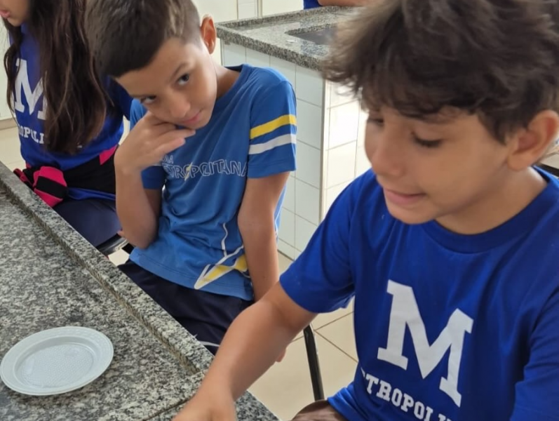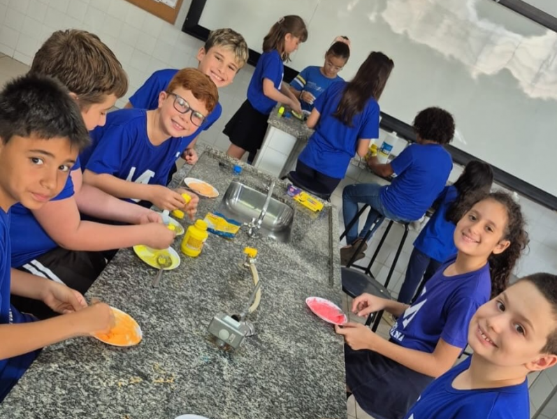 Sob a orientação da professora Carina, os alunos do 4º ano participaram de uma aula prática no laboratório de Ciências, colocando em ação os conhecimentos adquiridos sobre misturas homogêneas e heterogêneas.