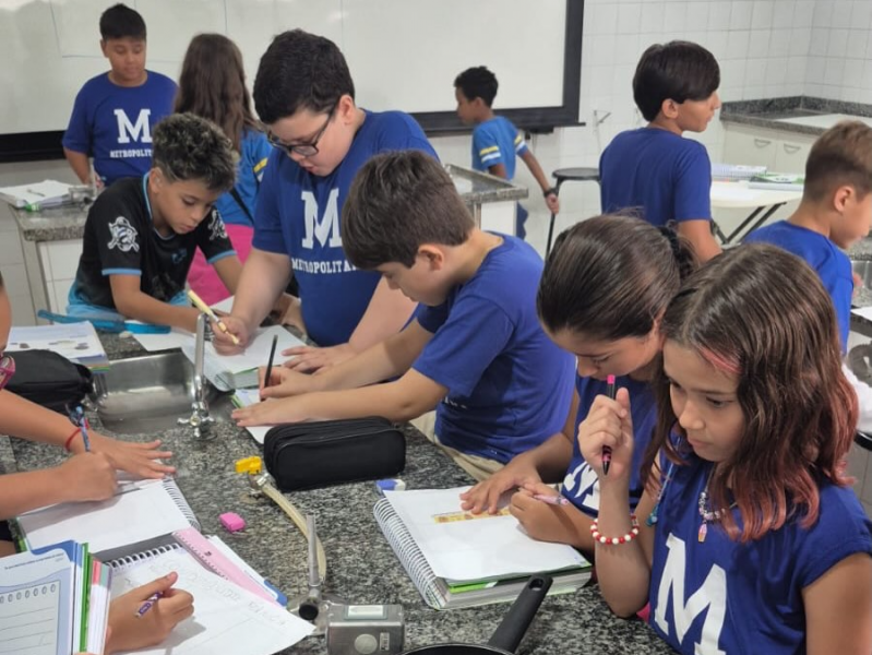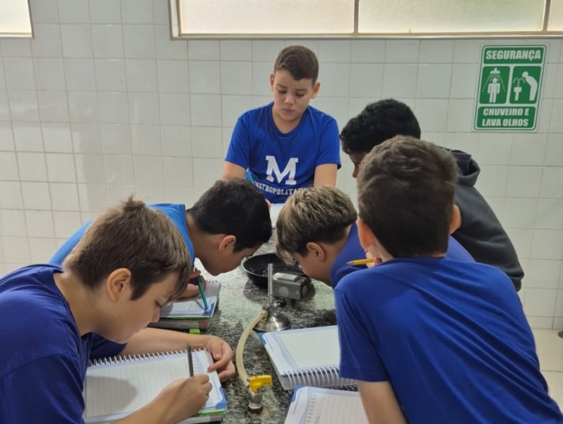 Os alunos dos 5º anos participaram de uma aula experimental no laboratório de Ciências, explorando o conceito de condutibilidade térmica por meio de atividades práticas e investigativas.