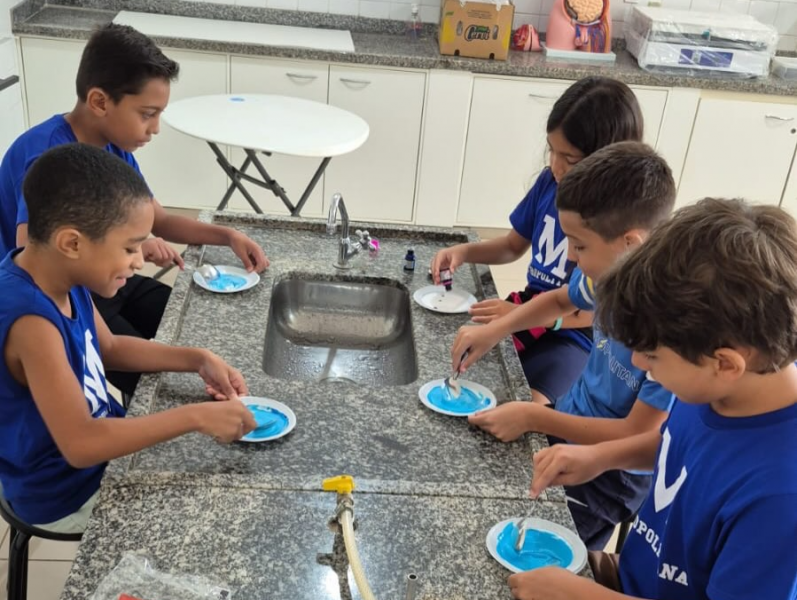 Sob a orientação da professora Carina, os alunos do 4º ano participaram de uma aula prática no laboratório de Ciências, colocando em ação os conhecimentos adquiridos sobre misturas homogêneas e heterogêneas.