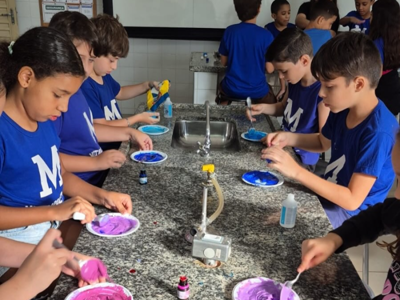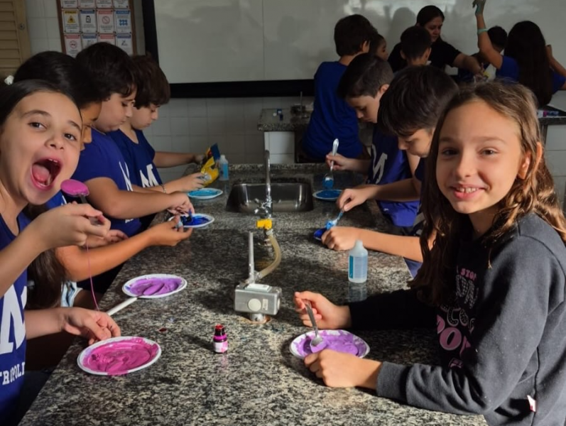 Após estudarem os conceitos teóricos em sala, os estudantes realizaram a produção de slime como forma de experimentar, na prática, o comportamento dos ingredientes ao serem combinados. A atividade envolveu a leitura da receita, a organização dos materiais, a execução do experimento e a elaboração de conclusões a partir da observação dos resultados.