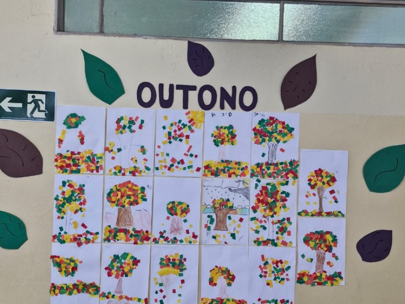 A turma do Integral II trabalhou o tema outono por meio de atividades de recorte e colagem, com a orientação das professoras Janaína e Beatriz.