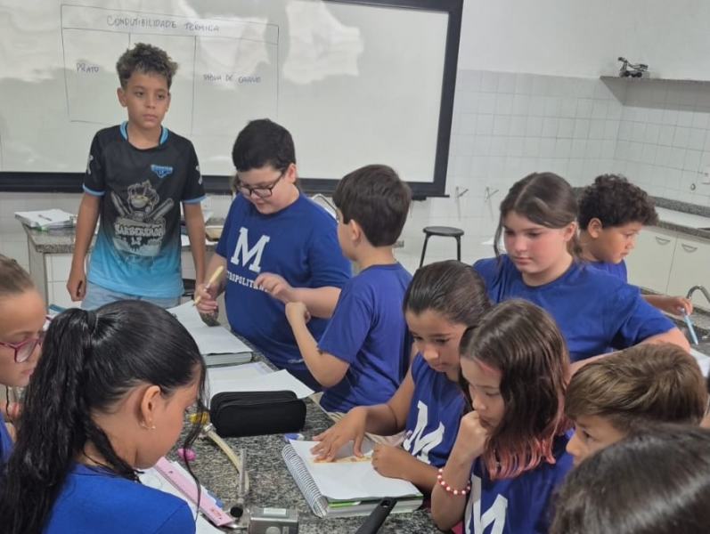 Os alunos dos 5º anos participaram de uma aula experimental no laboratório de Ciências, explorando o conceito de condutibilidade térmica por meio de atividades práticas e investigativas.